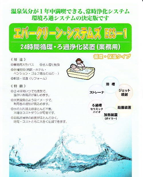 浴用循環濾過機(エバークリーン・システムズ)は24時間お湯を循環させ、いつでもお風呂を楽しむ事ができます。特に中・大型施設などに向いた設備となっています。