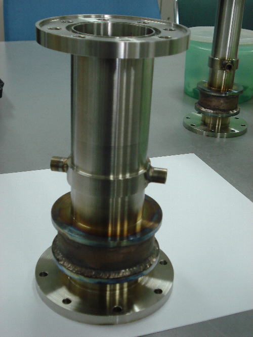 ステンレス鋼の筒(溶接張り合わせ)に石英ガラスの窓を3方向取り付けた試験装置。