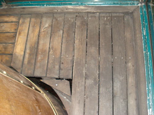 (木製の床板を剥がし、壁の塗装と床のフレーム枠の錆び止め処理を実施。)
